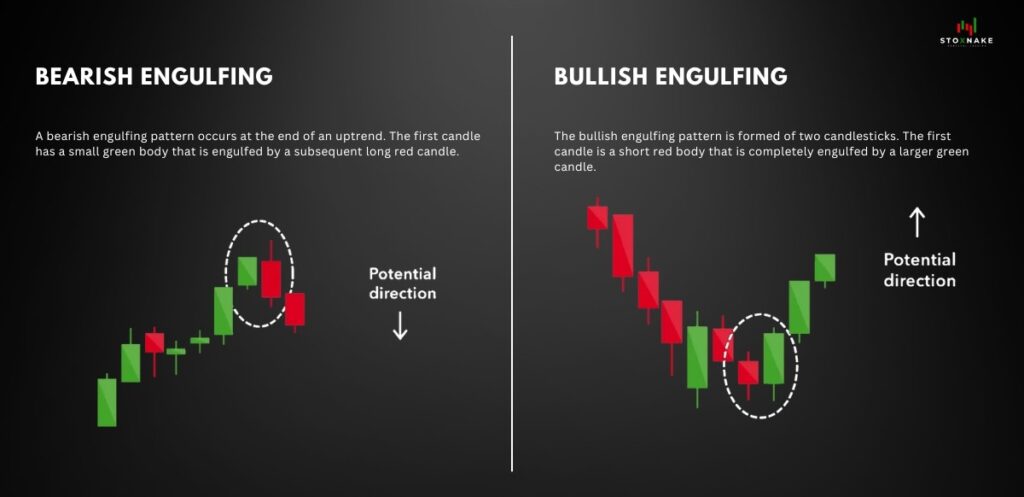 - What it means: A bullish engulfing pattern signals a potential reversal to the upside, while a bearish engulfing pattern signals a potential reversal to the downside.