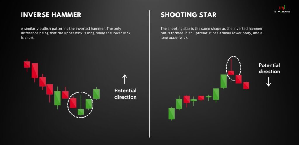 - What it looks like: Both patterns have a small body and a long upper wick. The Shooting Star appears during an uptrend, while the Inverted Hammer appears during a downtrend.