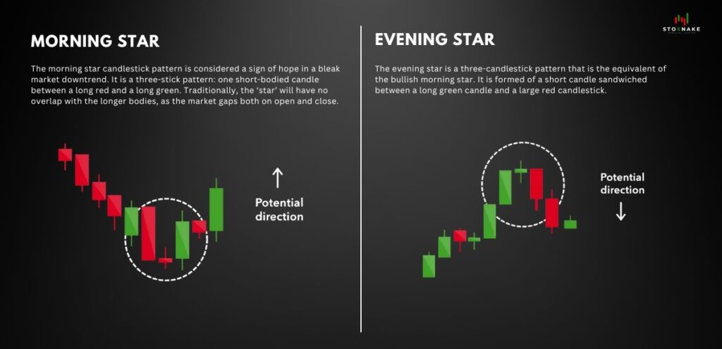 - What it means: The Morning Star signals a potential bullish reversal, while the Evening Star signals a potential bearish reversal.