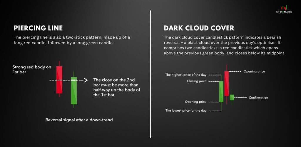 - What it means: The Piercing Line signals a potential bullish reversal, while the Dark Cloud Cover signals a potential bearish reversal.