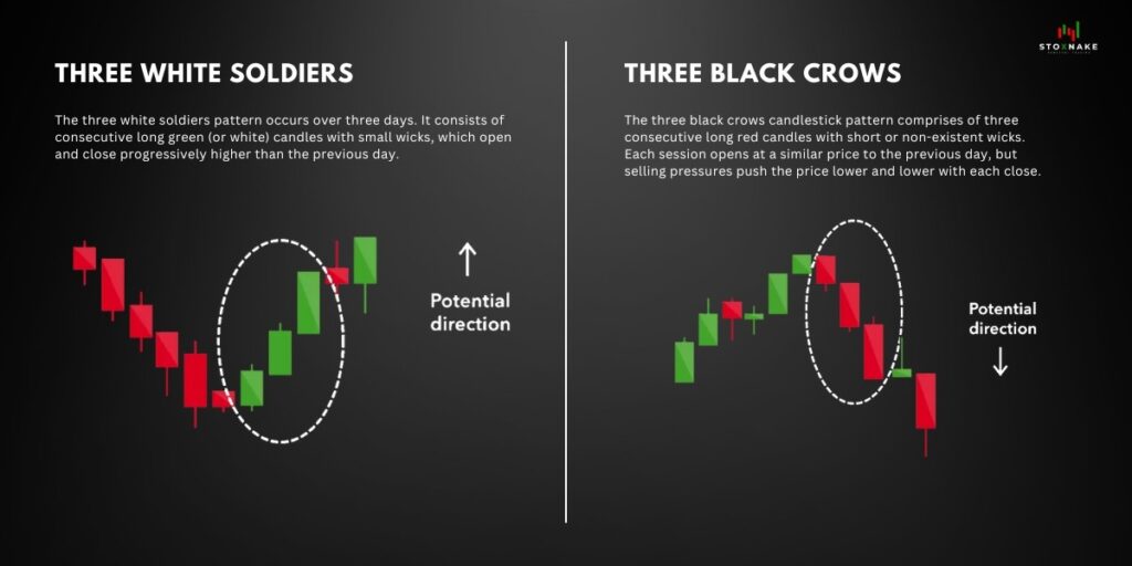 - What it means: Three White Soldiers signal strong buying pressure, while Three Black Crows signal strong selling pressure.